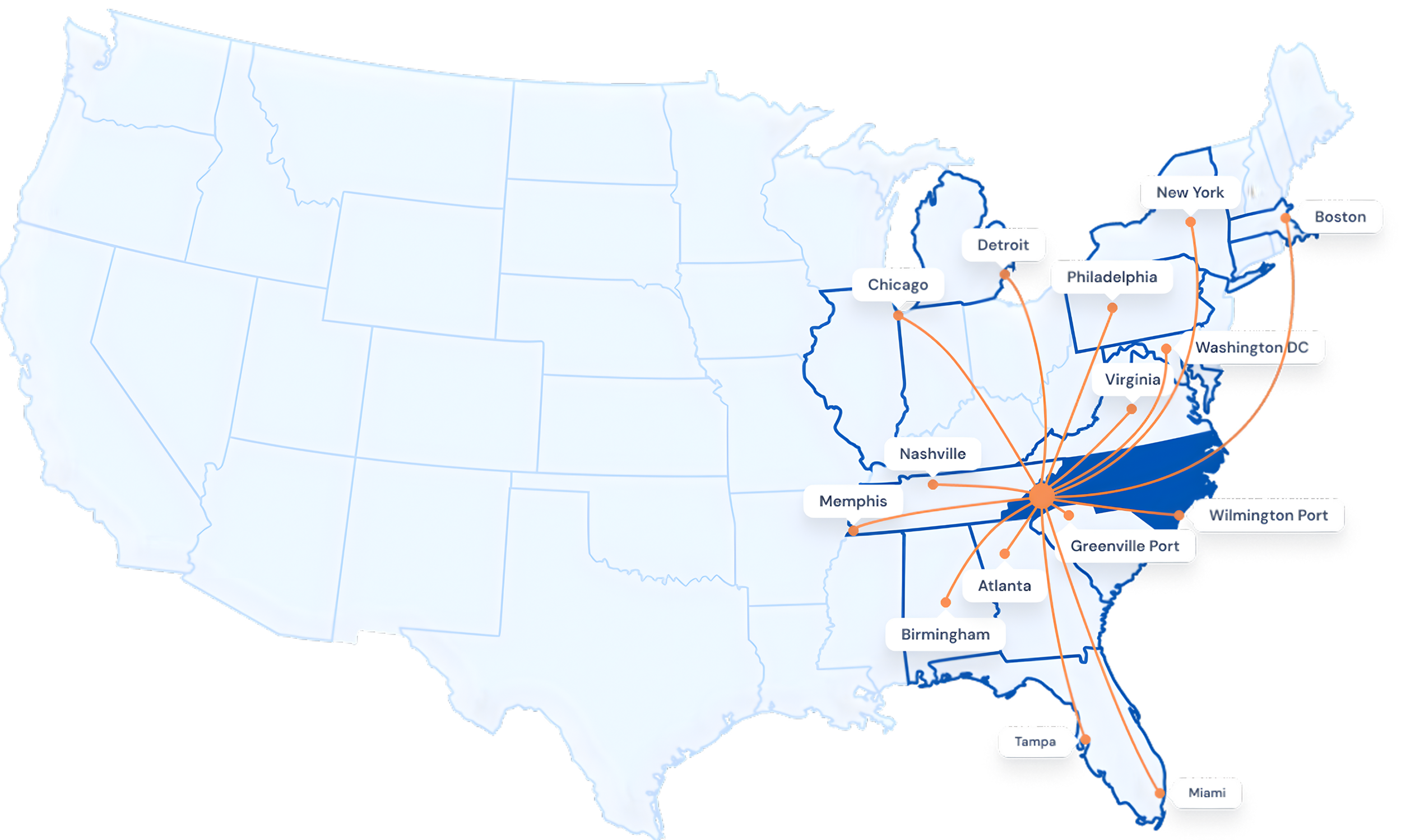 Our sites offer access to major interstates, CSX and Norfolk Southern rail, Wilmington and Charleston sea ports, and inland ports for streamlined logistics.